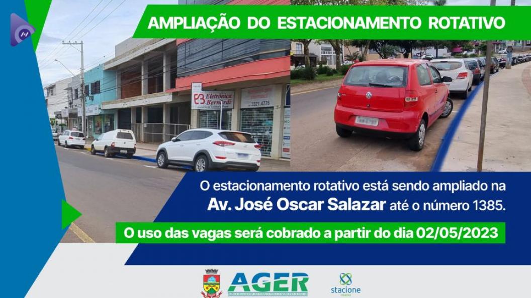 A Prefeitura de Erechim, por meio da Secretaria de Obras Públicas, Habitação, Segurança e Proteção Social de Erechim e Diretoria de Trânsito, informa a população, que o estacionamento rotativo, administrado pela concessionária Stacione Erechim, vai entrar em funcionamento na avenida José Oscar Salazar. O uso das vagas será cobrado a partir do dia 02/05/2023, as vagas iniciam no entroncamento com a avenida Caldas Júnior e vão até o número 1385, conforme o decreto número 5.560/23.