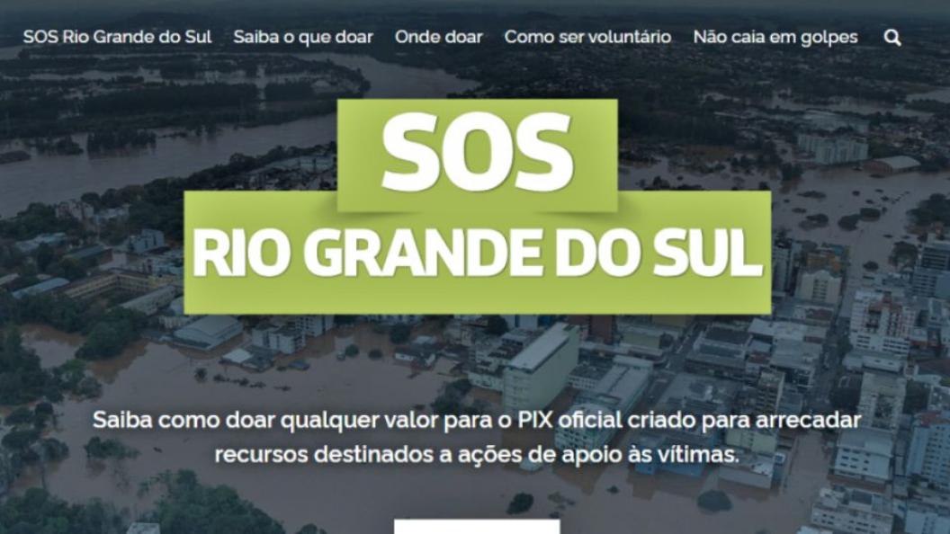 Na abertura do site, o SOS Rio Grande do Sul fornece ao visitante informações sobre doações por pix para ações de apoio às vítimas. Ao clicar em Leia Mais, o usuário acessa os dados da conta oficial do Estado e das prefeituras que também recebem contribuições financeiras.