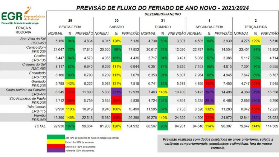 De sexta (29/12) até a terça-feira (02/01), período em que os usuários farão os deslocamentos por diversos municípios, são esperados 499,5 mil veículos nas rodovias administradas. Conforme a Gerência Operacional da EGR (Goper), o aumento da movimentação ocorre principalmente nas rodovias que ligam a região metropolitana de Porto Alegre ao litoral, ou seja, pela ERS-040 — onde são esperados 127,1 mil veículos nos cinco dias, um fluxo 72% superior em comparação com um final de semana normal. Pela ERS-474, em Santo Antônio da Patrulha, outra importante ligação do interior do estado, Vales do Sinos, Caí e Paranhana ao Litoral, são estimados 66,3 mil veículos, movimento 137% superior.