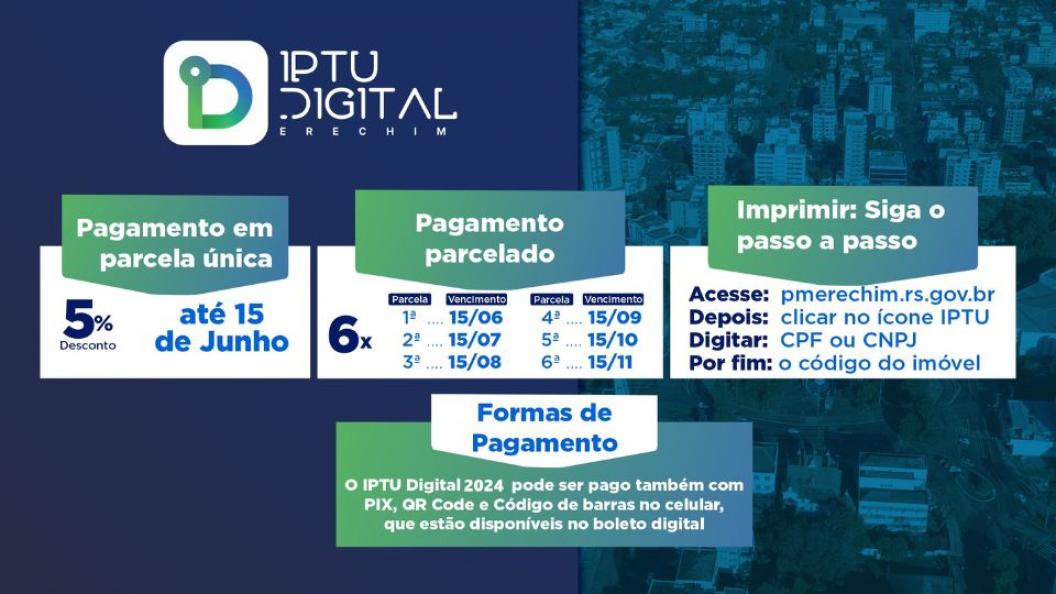 A Prefeitura Municipal de Erechim, por meio Secretaria Municipal da Fazenda, informa aos contribuintes que o Imposto Predial e Territorial Urbano (IPTU Digital 2024) e a Taxa de Coleta de Lixo de 2024 já estão disponíveis aos contribuintes. O pagamento do IPTU, em parcela única, com desconto de 5%, tem prazo até o dia 15/06/2024. Para lembrar, o IPTU é digital, não existe mais carnê impresso.