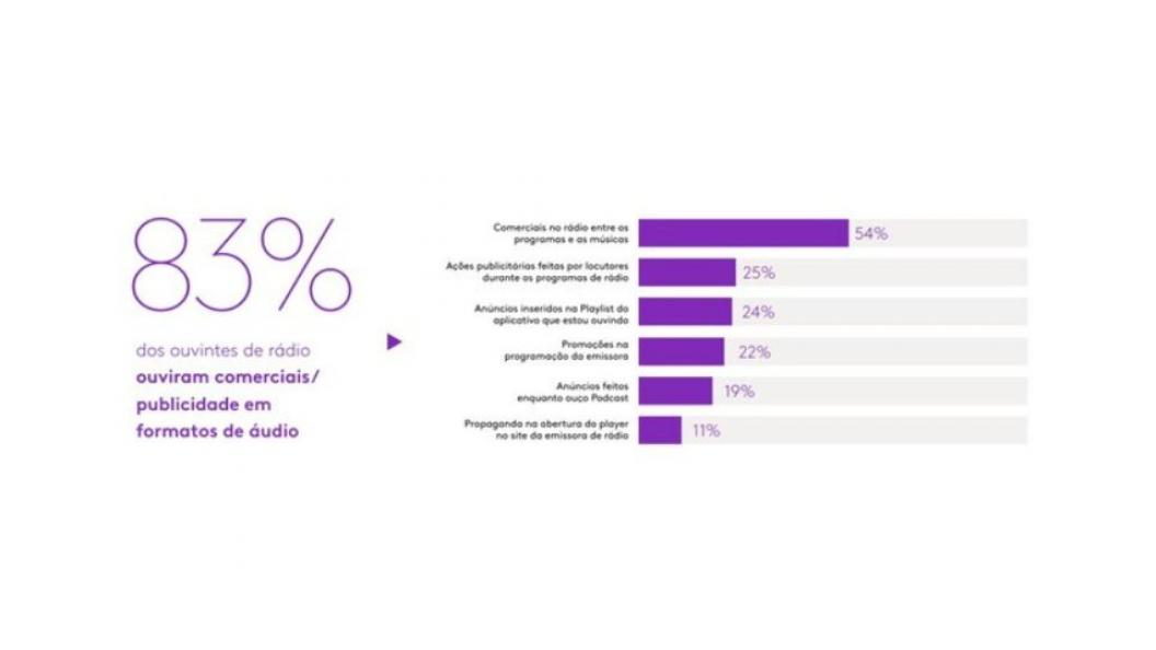 Os ouvintes de rádio demonstram alta receptividade à publicidade: 83% afirmam ter escutado comerciais em algum formato de áudio, sendo que 38% já compraram ou pesquisaram produtos após ouvirem anúncios no rádio. Esse dado reforça o rádio como um meio eficaz para a publicidade, criando alto grau de conversão e engajamento.